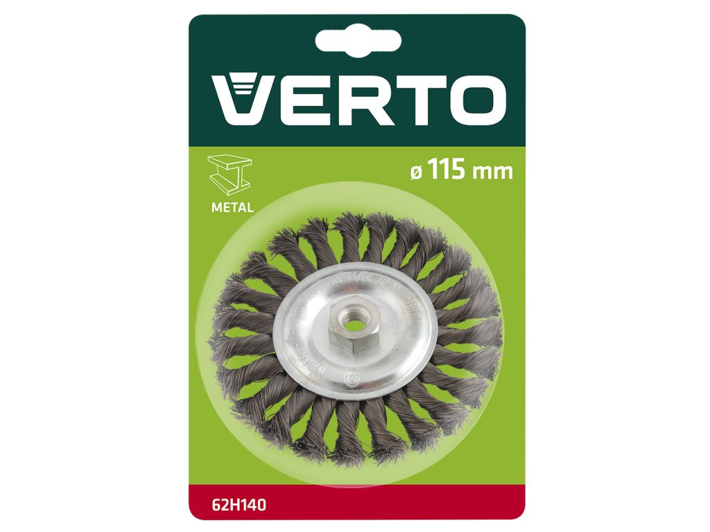 drátěný kartáč VERTO (ref. 62H140) o průměru 115 mm, vyrobený z ocelového drátu o tloušťce 0,33 mm. Zesílená konstrukce karoserie umožňuje efektivní čištění ocelových konstrukcí. Montáž uzpůsobená ke spolupráci s úhlovými brusky. VERTO nabízí sortiment elektrického nářadí a příslušenství pro každého kutila.