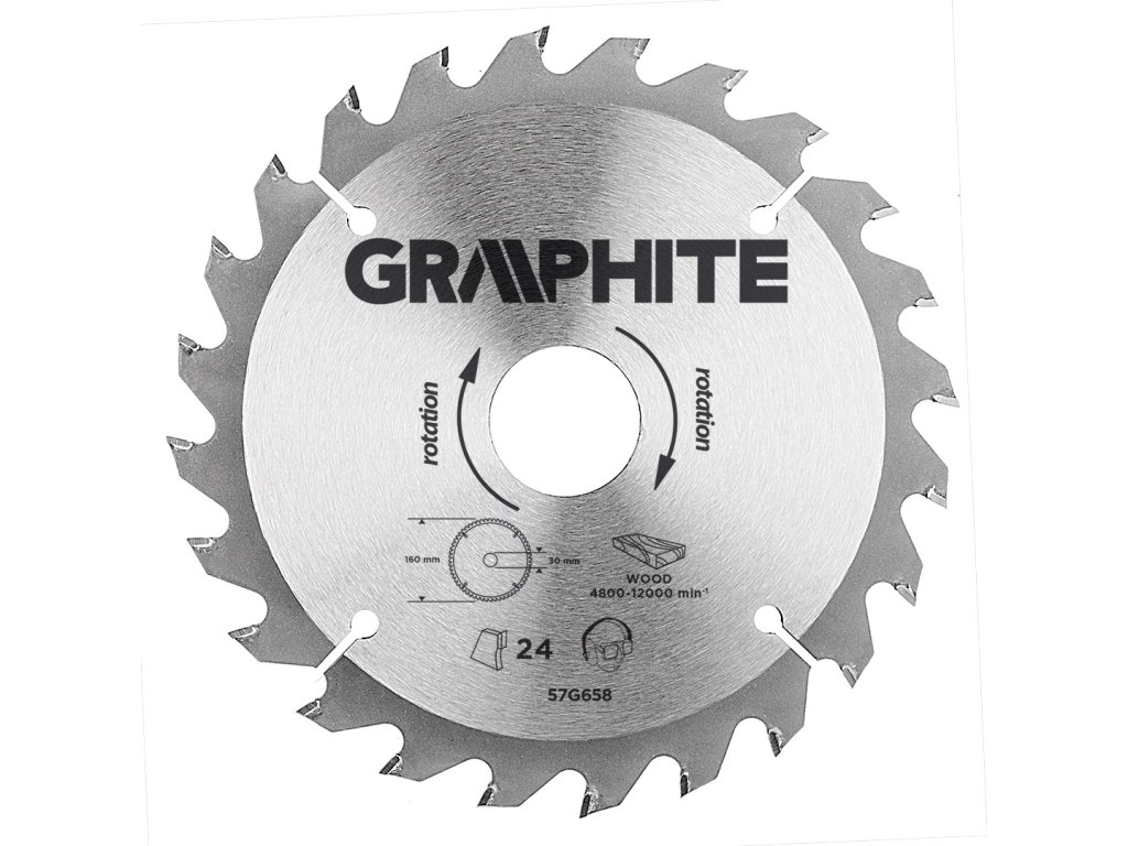 pilový kotouč GRAPHITE Widia (ref. 57H658) o vnějším průměru 160 mm, vyrobený ze slitiny manganové oceli MN65 s vysokou odolností vůči teplu a deformaci. Zuby s tvrdokovovými destičkami YG6A umožňují středně přesné řezání dřeva a materiálů na bázi dřeva, jako jsou překližky, dřevotřískové desky, MDF. Redukční kroužky, které jsou součástí balení, umožňují použití kotouče s většinou modelů pil.
