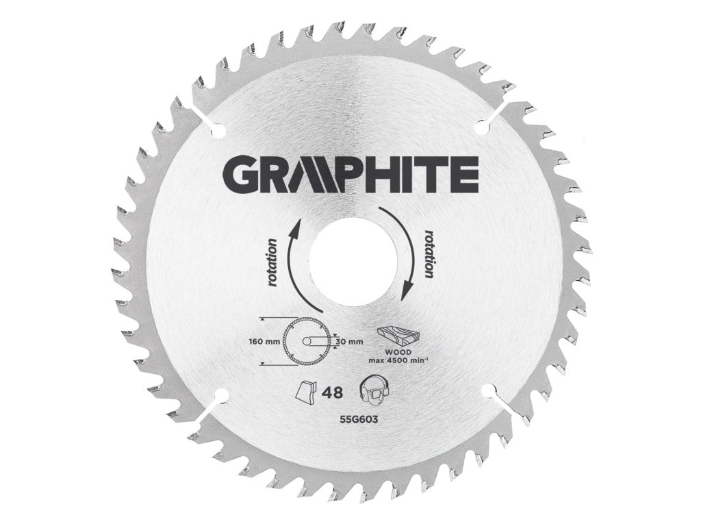 Vidiový pilový kotouč GRAPHITE (ref. č. 55H603) o průměrech 160 mm, vyrobený ze slitny manganové oceli MN65 s vysokou odolností proti teplotě a deformaci. Zuby s nástrčkami z tvrdých slitin uhlíku YG6A umožňují hrubé řezání dřeva a materiálů na bázi dřeva, jako je překližka, dřevotříska, MDF. Redukční kroužky obsažené v balení umožňují použití kotouče pro většinu modelů pil.