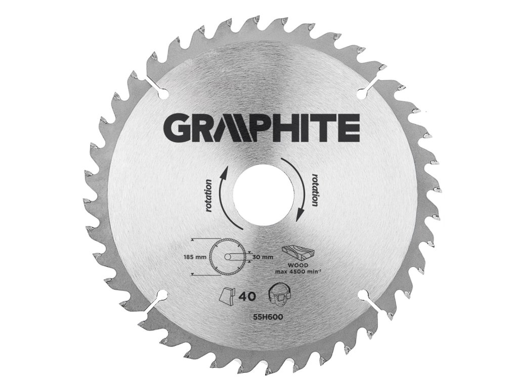 Vidiový pilový kotouč GRAPHITE (ref. č. 55H600) o průměrech 185 mm, vyrobený ze slitny manganové oceli MN65 s vysokou odolností proti teplotě a deformaci. Zuby s nástrčkami z tvrdých slitin uhlíku YG6A umožňují hrubé řezání dřeva a materiálů na bázi dřeva, jako je překližka, dřevotříska, MDF. Redukční kroužky obsažené v balení umožňují použití kotouče pro většinu modelů pil.