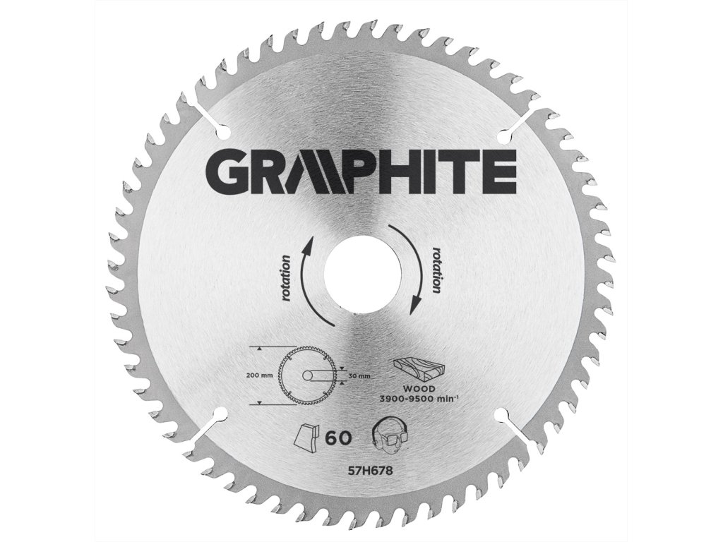 Vidlicový pilový kotouč GRAPHITE (ref. 57H678) o vnějším průměru 200 mm, vyrobený ze slitiny manganové oceli MN65 s vysokou odolností vůči teplu a deformaci. Zuby s tvrdokovovými destičkami YG6A umožňují přesné řezání dřeva a materiálů na bázi dřeva, jako jsou překližka, dřevotřískové desky, MDF. Přiložené redukční kroužky umožňují použití kotouče s většinou modelů pil.