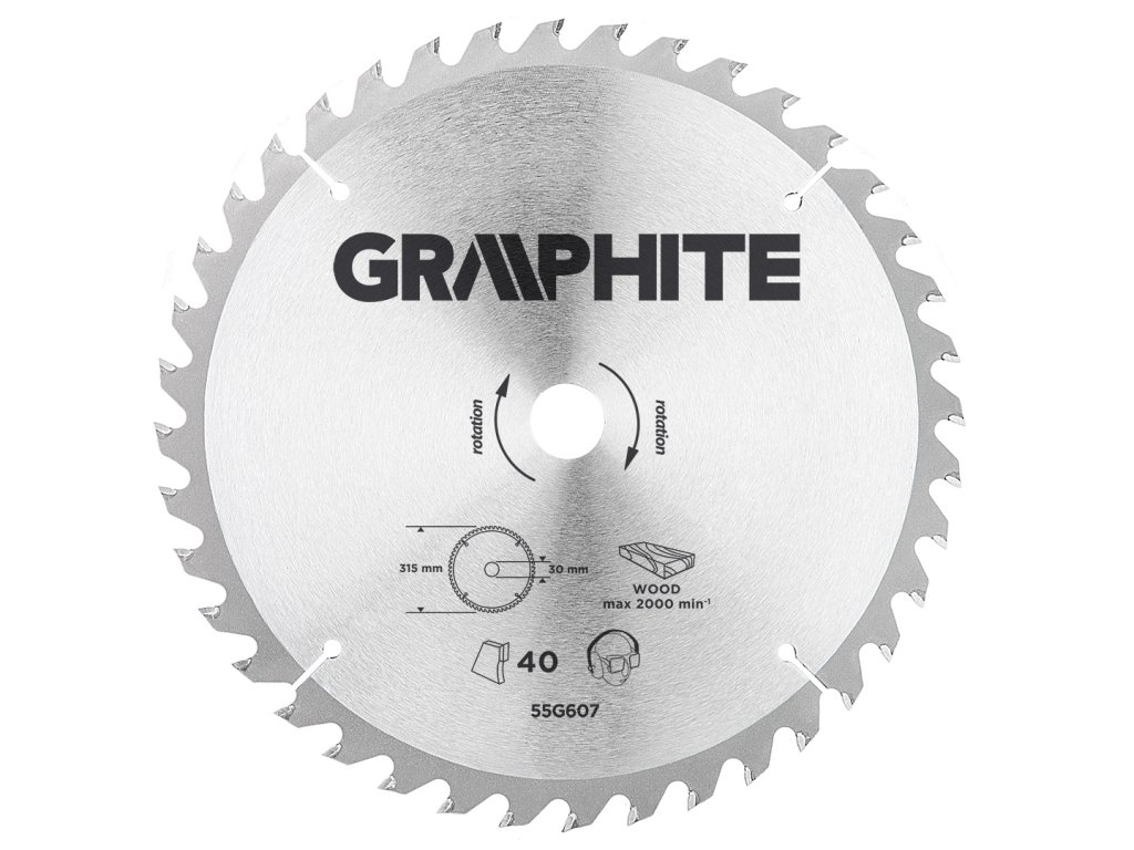Vidiový pilový kotouč GRAPHITE (ref. č. 55H607) o průměrech 315 mm, vyrobený ze slitny manganové oceli MN65 s vysokou odolností proti teplotě a deformaci. Zuby s nástrčkami z tvrdých slitin uhlíku YG6A umožňují hrubé řezání dřeva a materiálů na bázi dřeva, jako je překližka, dřevotříska, MDF. Redukční kroužky obsažené v balení umožňují použití kotouče pro většinu modelů pil.