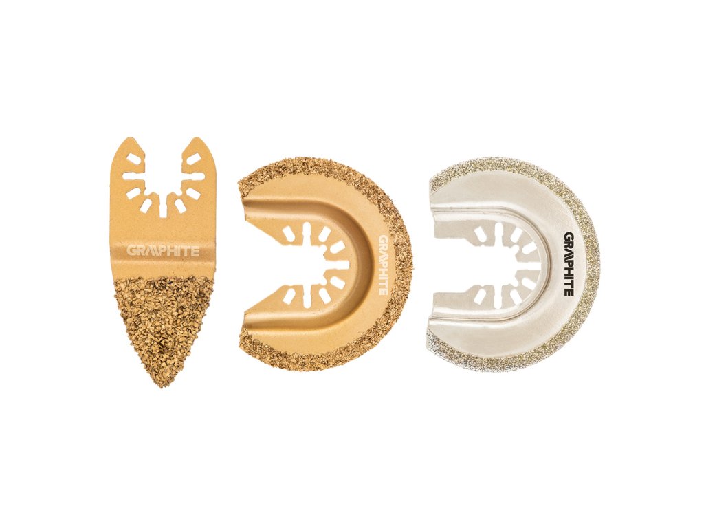 Sada čepelí pro keramiku GRAPHITE, 3 ks. Umožňuje přesné řezání obkladů přímou čarou a odstraňování spárovací hmoty pomocí multinástroje GRAPHITE.