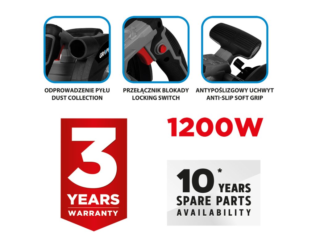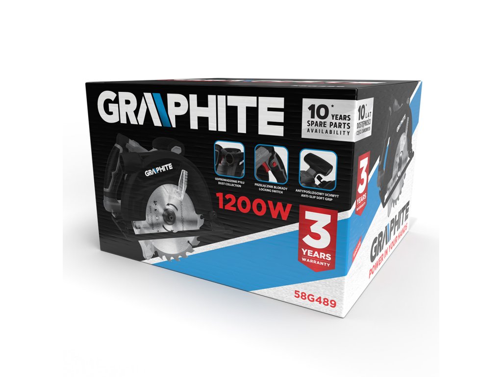 Okružní pila o výkonu 1200 W, 185 mm 58G489 od společnosti GRAPHITE má výkon 1200 W a 5500 otáček za minutu a je kompatibilní s kotoučem o průměru 185 mm a vnitřním průměrem 20 mm. Má možnost řezání pod úhlem 0° až 63 mm a 45° až 42 mm a dodává se s 2 m kabelem. Okružní pila GRAPHITE nabízena s vodítkem a klíčem.
