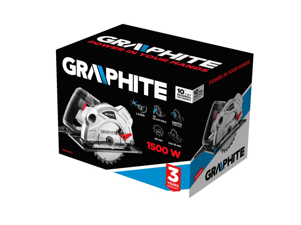 Kotoučová pila GRAPHITE s motorem o výkonu 1500W, který umožňuje práci s rychlostí do 5800 otáček za minutu. Zařízení je uzpůsobeno pro práci s kotouči o vnějším průměru 185 mm a umožňuje řezání do materiálů o tloušťce do 65 mm. Existuje také možnost řezání pod úhlem do 45°. Nastavení úhlu a hloubky řezání se provádí bez použití nástrojů – k nastavení parametrů slouží speciální stupnice. Bezpečnost obsluhující osoby zajišťuje dvoustupňový spínač pro ochranu před náhodným spuštěním. Pohodlnou a bezpečnou manipulaci s elektrickým zařízením zaručuje dodatečná třmenová rukojeť se širokou plochou uchopení. Na místě viditelném pro obsluhující osobu se nachází indikátor s informací o připojení elektrického zařízení do sítě a jeho připravenosti k práci. Hlavní kryt kotouče je vyroben ze slitiny hliníku. Laserový ukazatel integrovaný se zařízením usnadňuje určování směru řezání. Paralelní vodítko v příslušenství umožňuje precizní vedení pily podél okraje materiálu. Zařízení je vybaveno pružným a odolným napájecím kabelem v gumovém obalu o délce 3 m, který je také určen pro profesionální a průmyslové použití jak v interiéru, tak v exteriéru.