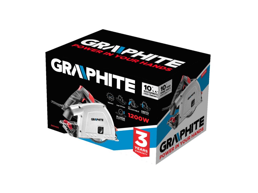 Ponorná pila GRAPHITE o výkonu 1200W je precizní zařízení, které slouží k provádění řezů do materiálů, jako je dřevo, laminát nebo hliník. Konstrukce ponorné pily umožňuje provádění ponorných řezů na libovolném místě materiálu – bez nutnosti začínat řezání od okraje, jako je tomu u tradičních kotoučových pil. Zařízení spolupracuje s řeznými kotouči o průměru 165 mm a umožňuje práci s rychlostí nastavitelnou v rozsahu 2200-5200 ot./min. Pro zvýšení přesnosti při provádění delších formátovacích řezů se doporučuje používat vodicí lištu, která se také nachází v nabídce značky GRAPHITE. Maximální tloušťka řezání bez vodicí lišty je 57 mm, s lištou 52 mm. Zařízení je vybaveno zarážkou hloubky s přesnou stupnicí a ukazatelem, který umožňuje snadno nastavit hloubku jak při práci s lištou, tak i bez ní. Patka ponorné pily je vybavena systémem nastavení vůle ve vztahu k vodící liště a umožňuje přizpůsobit úhel řezu v rozsahu 0-47°. Kryt kotouče je vyroben z hliníku, a celá boční strana zařízení je vyprofilována tak, aby se minimalizovala vzdálenost mezi kotoučem a vnějším okrajem pláště. Znamená to, že minimální vzdálenost linie řezu od překážky např. ve formě stěny je jen 11,5 mm. Zařízení je vybaveno otočným vyhazováním pilin s možností připojení vysavače. Zařízení je vybaveno pružným a odolným napájecím kabelem v gumovém obalu o délce 2 m, který je také určen pro profesionální a průmyslové použití jak v interiéru, tak v exteriéru.