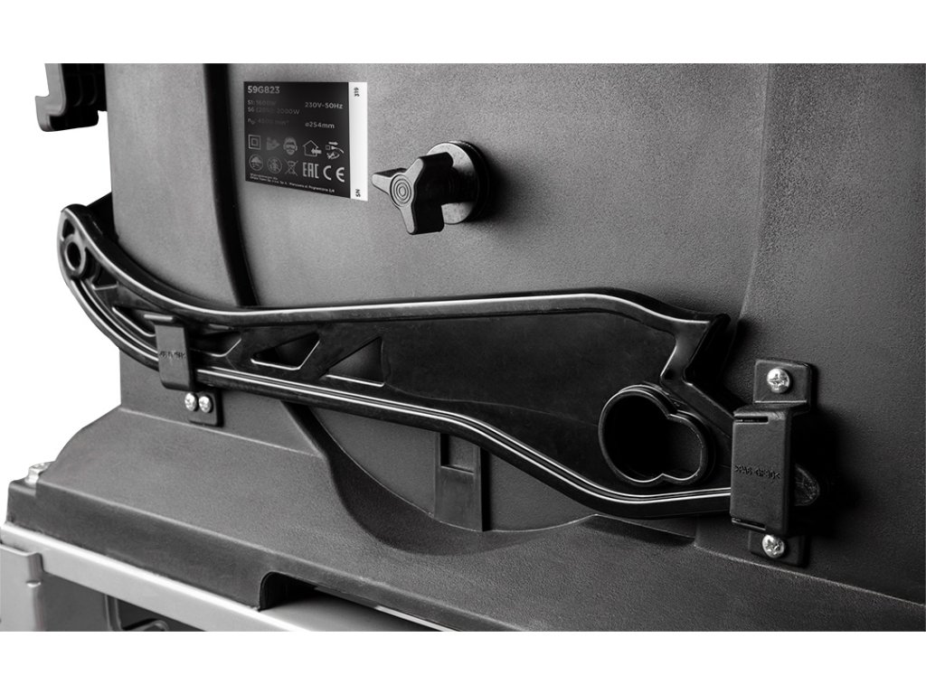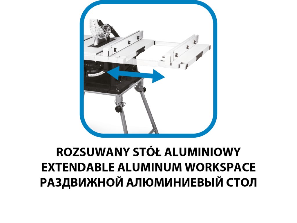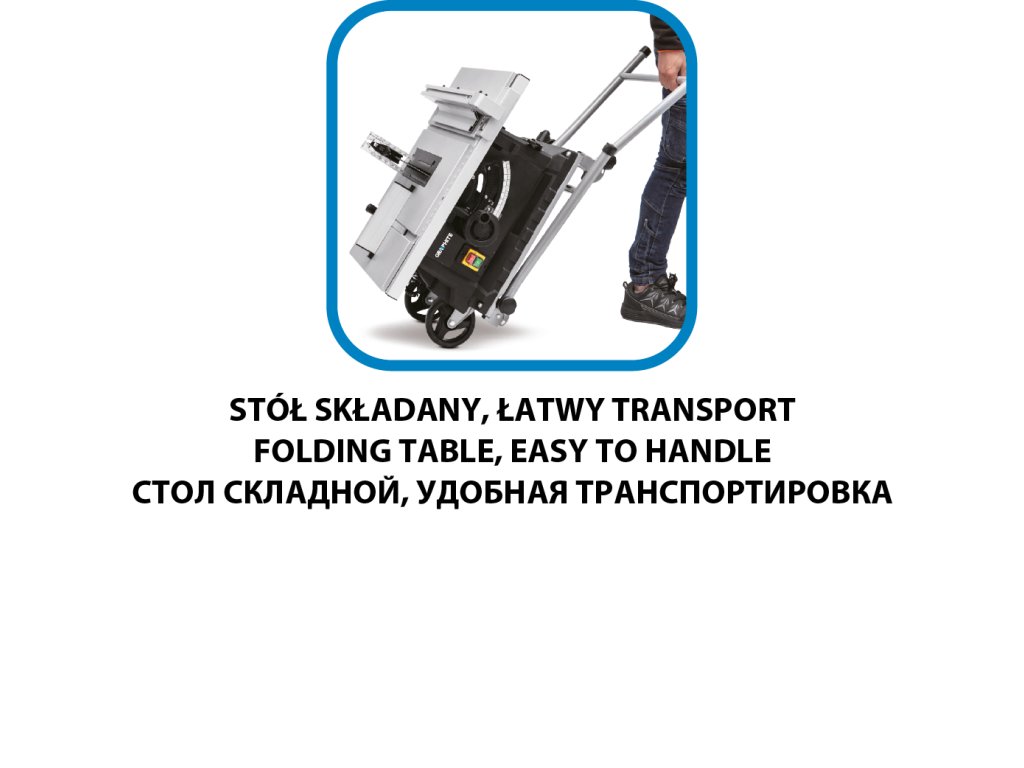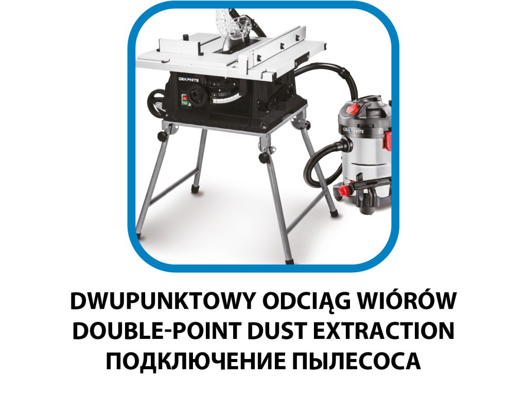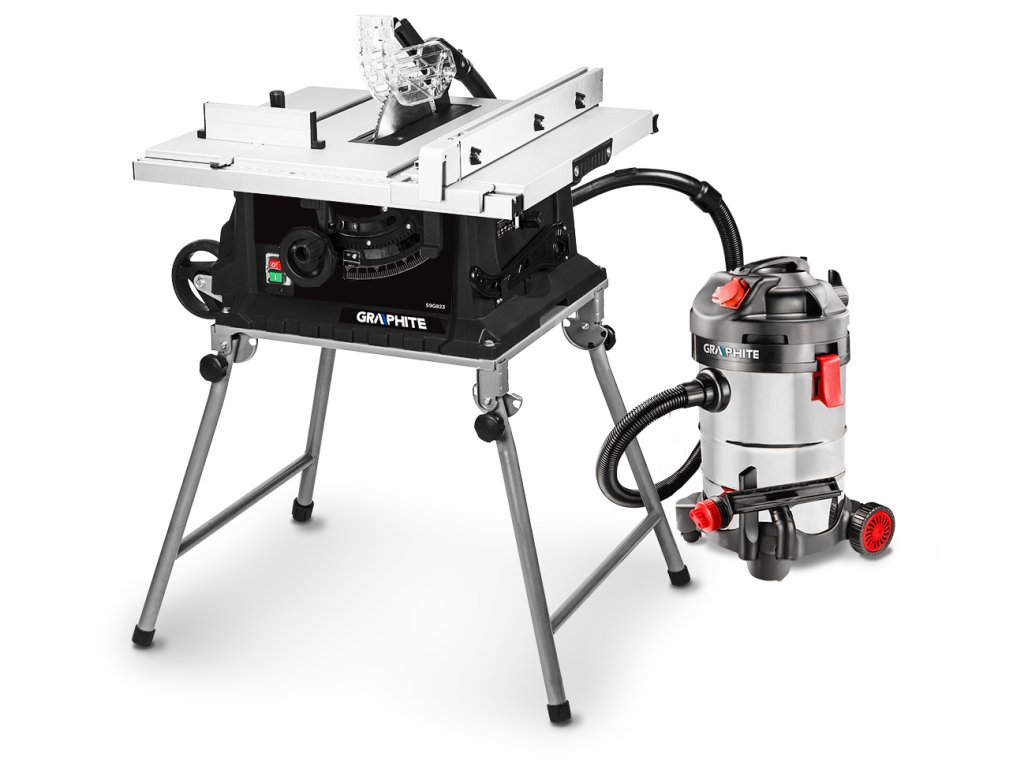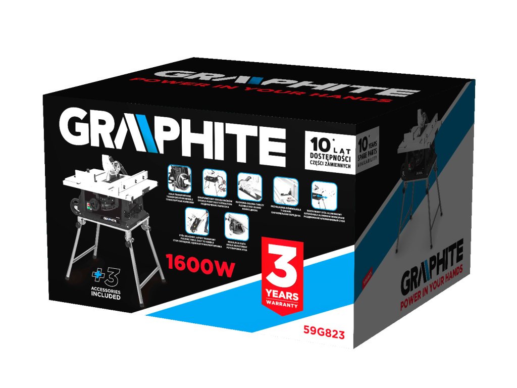 Stolní pila 1600 W, 254/30 mm, sklopný stůl 59G823 značky GRAPHITE je nářadí nabízené se sklopným hliníkovým stolem. Má výkon 1600 W (S1) nebo 2000 W (S6 20%). Má nůž 254/30 mm a dosahuje 4800 otáček za minutu. Rozsah zkosení řezu je 0 až 45 stupňů a hlavní řez je 80/55 mm. Stůl má rozměry 560 x 670-1040 x 1000 mm. Konstrukci doplňuje pohyblivý ochranný kryt čepele zvyšující bezpečnost, jakož i odsavač třísek pro udržování pořádku. Pila má nastavitelnou kočku a paralelní plot. Stroj váží 31 kg. Nástroj se dodává se stativem, ramenní opěrkou, rukojetí stativu a pomocnou rukojetí, montážními šrouby a klíči. Pila značky GRAPHITE je určena pro profesionály a domácí kutily.