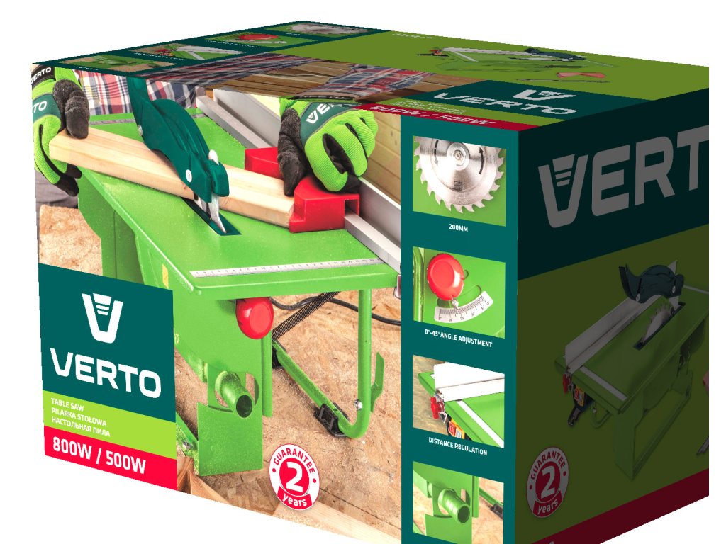 800 W Stolní pila VERTO (ref. 52G219) je zařízení určené mimo jiné k řezání prvků ze dřeva, materiálů na bázi dřeva. Má řezací nůž o průměru 200 mm a možnost rychlého nastavení oblíbených úhlů řezu. Rozsah úhlového a kuželového řezání je od 0° do 45°. Pila má pracovní stůl o rozměrech 505 x 335 mm a výšce 240 mm. Dodává se s dorazovou tyčí, úhelníkem, přítlačnou tyčí a kroužkovým klíčem. Soulad s evropskými bezpečnostními normami zaručuje certifikát CE. VERTO nabízí řadu elektrického nářadí a příslušenství pro každého kutila.