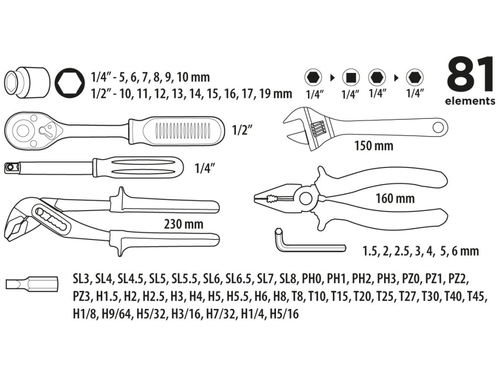 Súprava náradia ?”, ?”, 81 ks Materiál – uhlíková oceľ. Račňa 1/2”, 39 zubov; skrutkovacia rukoväť ?”, držiak na bity ?”, stolárske kladivo 200g, kľúče HEX 7 ks: 1.5, 2, 2.5, 3, 4, 5, 6 mm; kliešte univerzálne 160 mm, kliešte na potrubie 230 mm, nastaviteľný kľúč 150 mm, adaptér do skrutkovača na bity ?”, adaptér do skrutkovača na nástavce ?”, nástavce ?”, 9 ks: 10, 11, 12, 13, 14, 15, 16, 17, 19 mm; nástavce ?”, 6 ks: 5, 6, 7, 8, 9, 10 mm; bity 25 mm, 40 ks: PZ0, PZ1, 5xPZ2, PZ3, PH0, PH1, 5xPH2, PH3, SL3, SL4, SL4.5, SL5, SL5.5, SL6, SL6.5, SL7, SL8, T8, T10, T15, T20, T25, T27, T30, T40, T45, H1.5, H2, H2.5, H3, H4, H5, H5.5, H6, H8, H1/8, H9/64, H5/32, H3/16, H7/32, H1/4, H5/16.