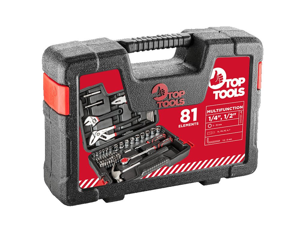 Sada nářadí Top Tools (ref. 38D510) je určena pro základní, lehké opravárenské práce. Obsahuje 81 kusů ve velikostech ?" a ?" uložených v praktickém a robustním plastovém kufříku. Obsahuje kompletní balení šestihranných nástrčných hlavic ve dvou velikostech, ráčnu a příslušenství. Všestrannost sady zvyšuje přítomnost univerzálních kleští, kleští na trubky, nastavitelného klíče, kladiva, šestihranných klíčů, šroubovacích bitů a příslušenství. Sada obsahuje také adaptéry na šroubováky, takže díly lze snadno používat s elektrickým nářadím.
