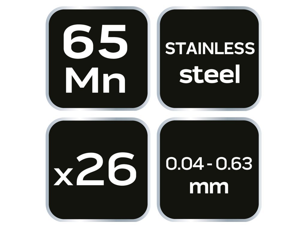 Štěrbinoměr / spárová měrka NEO s 26 listy pro přesné měření vůlí a štěrbin v motorech, ložiscích a technických spojích.