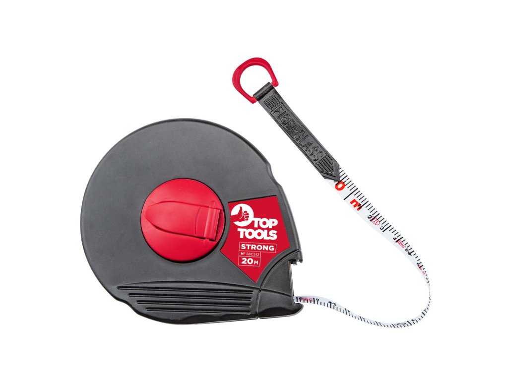 20 m dlouhá měřící páska Top Tools (ref. 27C512) je vyrobena z odolného skleněného vlákna a její kryt je z pevného plastu. Koncový háček umožňuje připevnit konec pásky pro snadné měření. Výsuvná rukojeť umožňuje polohovat pásku během práce.