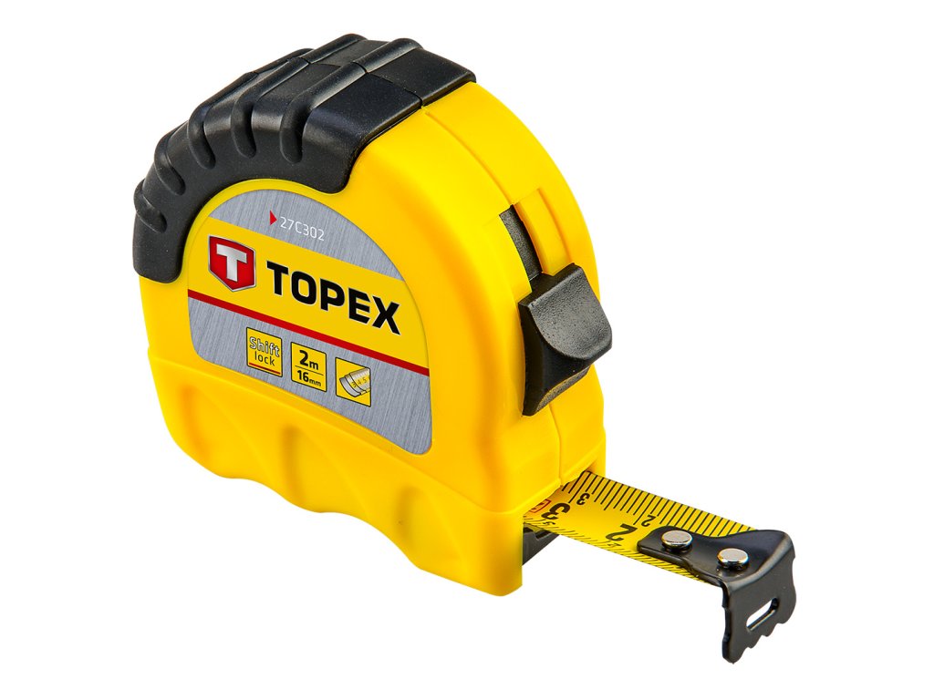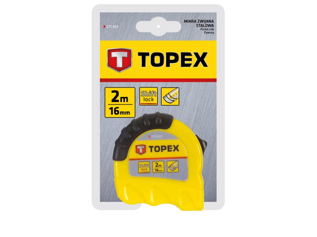 Ocelový rolovaný metr TOPEX (ref. č. 27C302) o délce 2 m je vybaven zámkem pásky. Dvojitá laková vrstva chrání tisk před odíráním. Tlumič nárazů při zasouvání pásky chrání háček před zlomením. Ergonomický tvar krytu umožňuje bezpečné a pohodlné uchopení a protiskluzový materiál poskytuje pohodlí a bezpečnost při práci. Spolehlivost zaručuje certifikát MID. Značka TOPEX je určena pro domácí kutily.