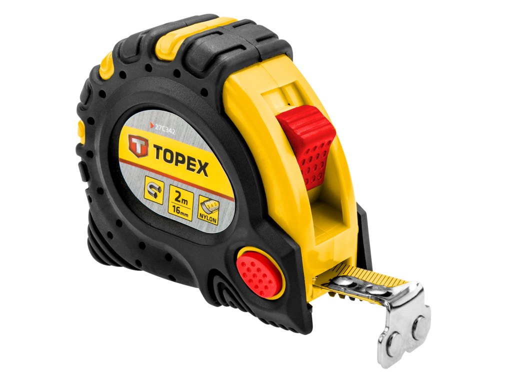 Ocelový rolovaný metr TOPEX (ref. 27C342) o délce 2 m má tři zámky pro zasouvání pásky. Nylonový povlak pásky chrání tisk před odíráním. Tlumič nárazů při zasouvání pásky chrání háček před zlomením. Magnetický hrot usnadňuje měření. Ergonomický tvar pouzdra umožňuje bezpečné a pohodlné uchopení a protiskluzový materiál zaručuje pohodlí a bezpečnost při práci. Spolehlivost zaručuje certifikát MID. Značka TOPEX je určena pro domácí kutily.