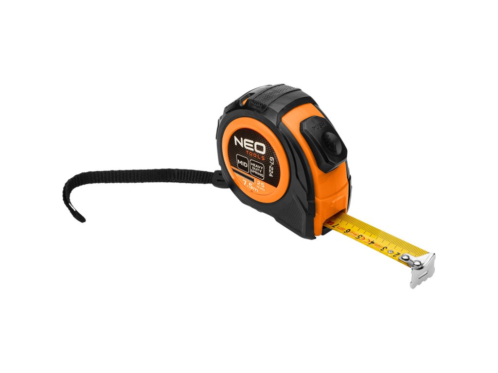 Ocelový rolovací metr 7,5 m x 25 mm, automatický zámek, dvě tlačítka pro zastavení 67-224 od společnosti NEO TOOLS je nástroj o délce 7,5 ma šířce 25 mm. Je vybaven praktickou funkcí automatického zastavení, která zabraňuje samovolnému zasunutí rolny při jejím vysunutí, jakož i možností použití dvou blokovacích tlačítek. Pouzdro měřicího pásu NEO TOOLS je vyrobeno ze dvou druhů materiálu. Nástroj má lesklý povlak, který chrání stupnici před odíráním. Na druhé straně zabudovaný tlumič nárazů ovlivňuje šetrnější proces navíjení. Nástroj je v souladu s normou MID třídy II. Přídavek nylonu přispívá k odolnosti a pohodlnému používání tohoto měřicího pásu NEO TOOLS.