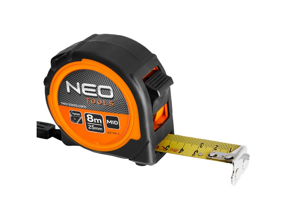 Ocelový rolovací metr 8 m x 25 mm, magnet 67-111-1 od společnosti NEO je praktický nástroj s délkou 8 ma šířkou pásky 25 mm se dvěma praktickými zámky na zasouvání. Jeho nylonový potah chrání výtisk před odíráním. Magnetický hrot a profil pásky usnadňují měření. Tlumič nárazů při zatahování pásky chrání háček před zlomením. Ergonomický tvar pouzdra umožňuje bezpečné a pohodlné uchopení a protiskluzový materiál zaručuje pohodlí a bezpečnost při práci. Spolehlivost zaručuje jeho výroba v souladu se směrnicí EU MID třídy II pro měřící přístroje. Značka NEO splňuje očekávání profesionálů.