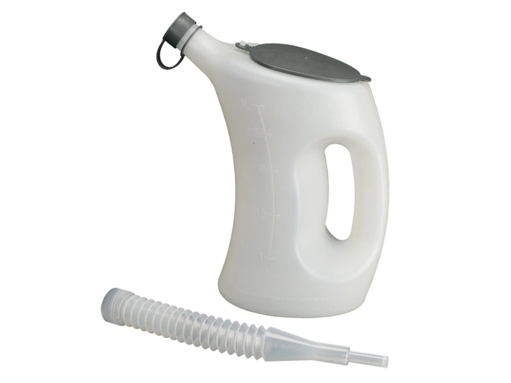 Odměrná nádoba s víkem-FLA-PE značky PRESSOL s ochranným krytem a ochranným uzávěrem na výstupu. Trychtýřový vývod. Německé, anglické a americké stupnice. Vhodné pro potraviny podle (EU) č.j. 10/2011 a FDA § 21 CFR 177.1520 Odolné vůči kyselinám, naftě a palivům.