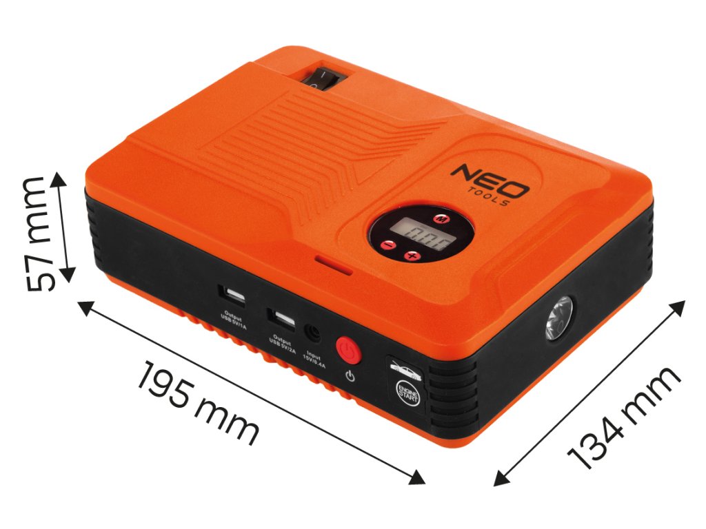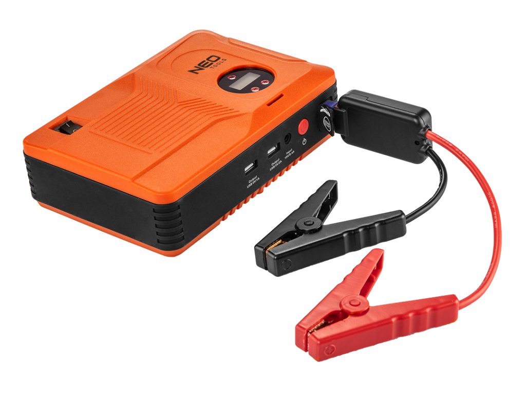 Startovací zařízení NEO "Jumpstarter" (ref. 11-997) je zařízení, které v sobě spojuje mnoho funkcí. Jumpstarter je užitečný zejména v zimních dnech, kdy teplota výrazně klesá a vznikají problémy se startováním motoru. Zařízení obsahuje baterii o kapacitě 14 000 mAh, která podporuje spuštění až do 400 A. Součástí balení jsou svorky na baterie. Jumpstarter bude podporovat také všechna zařízení v autě, která vyžadují elektrickou energii. Funkce powerbanky, kterou je zařízení vybaveno, umožňuje nabíjet telefony, tablety a notebooky. Jumpstarter je vybaven také kompresorem, pomocí kterého můžete kola nafouknout. Má také hořák, který je užitečný v různých situacích.