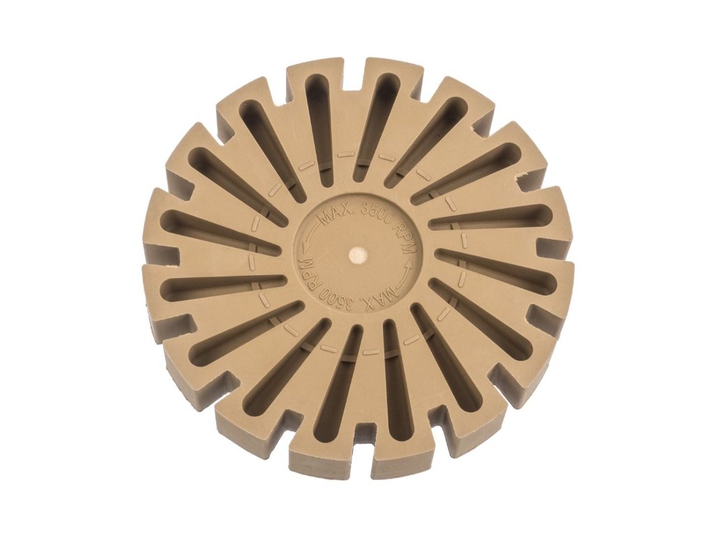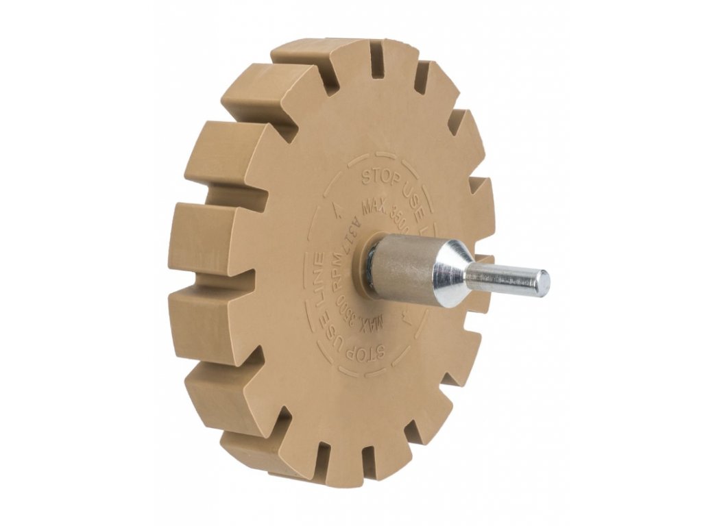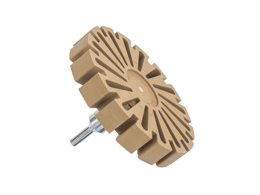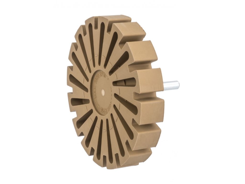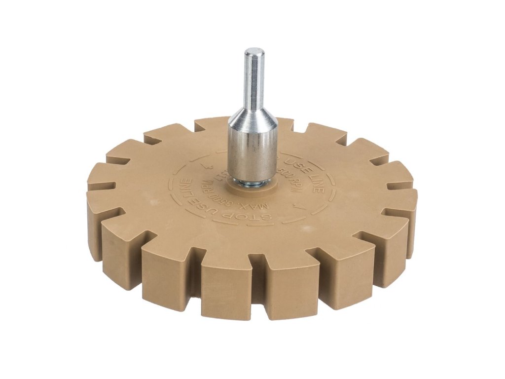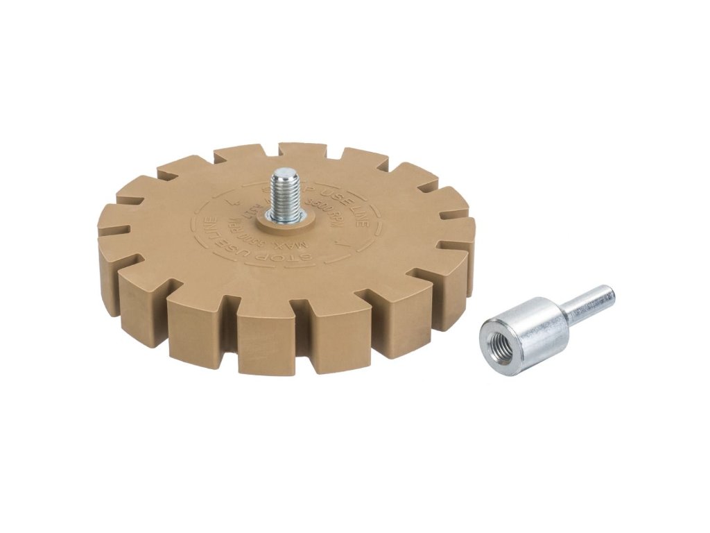 Vroubkovaný pryžový kotouč pro odstraňování lepidla, nálepek, fólie z ráfků, povrchů karoserií a jiných lakovaných předmětů. Kotouč lze připevnit na vrtačku, šroubovák nebo brusku pomocí adaptéru, který je součástí balení. Kotouč je vyroben ze speciální směsi měkké brusné gumy, která odstraňuje lepivou vrstvu. Úlomky použitého kotouče s odstraněnou vrstvou během provozu odpadávají ve formě jemného suchého prachu, který lze snadno odstranit.