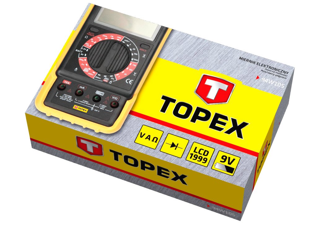 Univerzální elektronický měřič TOPEX (ref. 94W102) je určen k měření střídavého a stejnosměrného napětí, hodnoty střídavého proudu, elektrického odporu a diod. Tělo je vyrobeno z kvalitního plastu. Velký LCD displej usnadňuje čtení naměřených hodnot. Díky funkci HOLD lze měření zastavit a uložit. Certifikát CE zaručuje soulad s evropskými bezpečnostními normami. Značka TOPEX je určena pro domácí kutily.