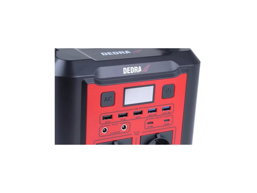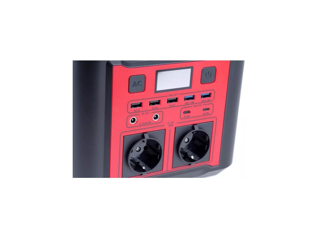 Nouzový napájecí zdroj energie 300/500W s kapacitou baterie 296Wh/20Ah/14,8V. Vestavěné AC zásuvky: 2x230V/50Hz, DC 9-12,6V/10A, USB 5V/2,1A port, 1x Typ C; 1x QC 3.0.