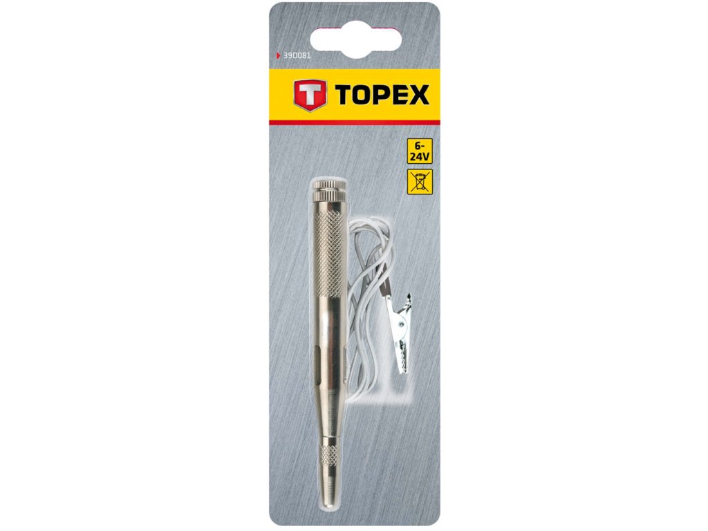 TOPEX zkoušečka instalací automobilů (ref. 39D081), 115 mm dlouhá. Umožňuje detekci toku napětí v rozsahu 6 - 24 V. Má kabel se zástrčkou pro tester a žabku, která usnadňuje měření. Značka TOPEX je určena pro domácí kutily.