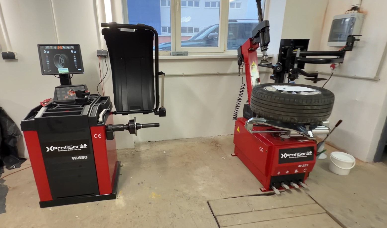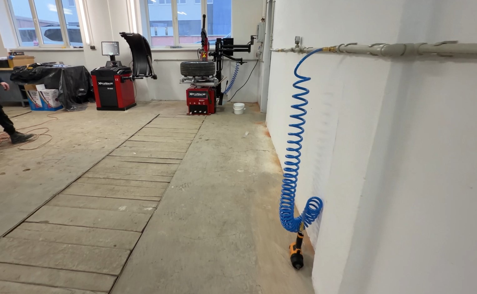 - Do zadní části místnosti: automatická přezouvačka s ramenem a vyvažovačka s laserem