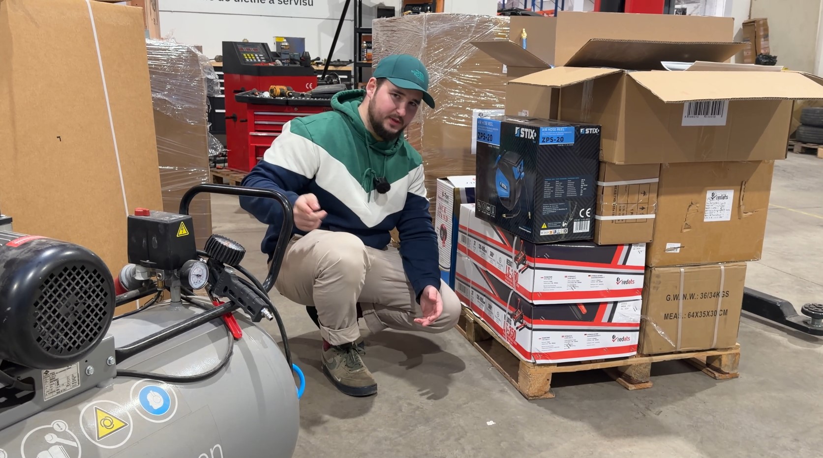 Po dokončení rozvodu, otestovali stroje a zapojili příslušenství (rázový utahovák, navíjecí pneumatickou hadici a další vybavení). Jako bonus zákazník obdržel balík spotřebního materiálu – čističe brzd a vybrané servisní spreje.