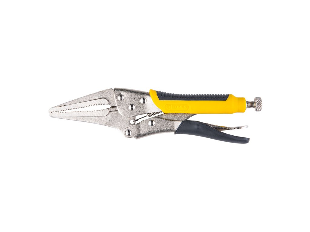 Fixační prodloužené kleště o délce 225 mm a pracovním rozsahu 0 - 55 mm pro upevňování a zabezpečení předmětů a materiálů pevně spolu. Svorky mají flexibilní a silný mechanismus, který umožňují pevné a bezpečné upevnění. V dílně se používají k upevnění dřeva, kovu nebo plastu při řezných a obráběcích pracích. V oblasti strojírenství a průmyslu se využívají k fixaci součástek, sponkování kabelů, upevnění trubek a podobně. Díky své všestrannosti jsou pružinové svorky neocenitelným nástrojem v mnoha situacích.
