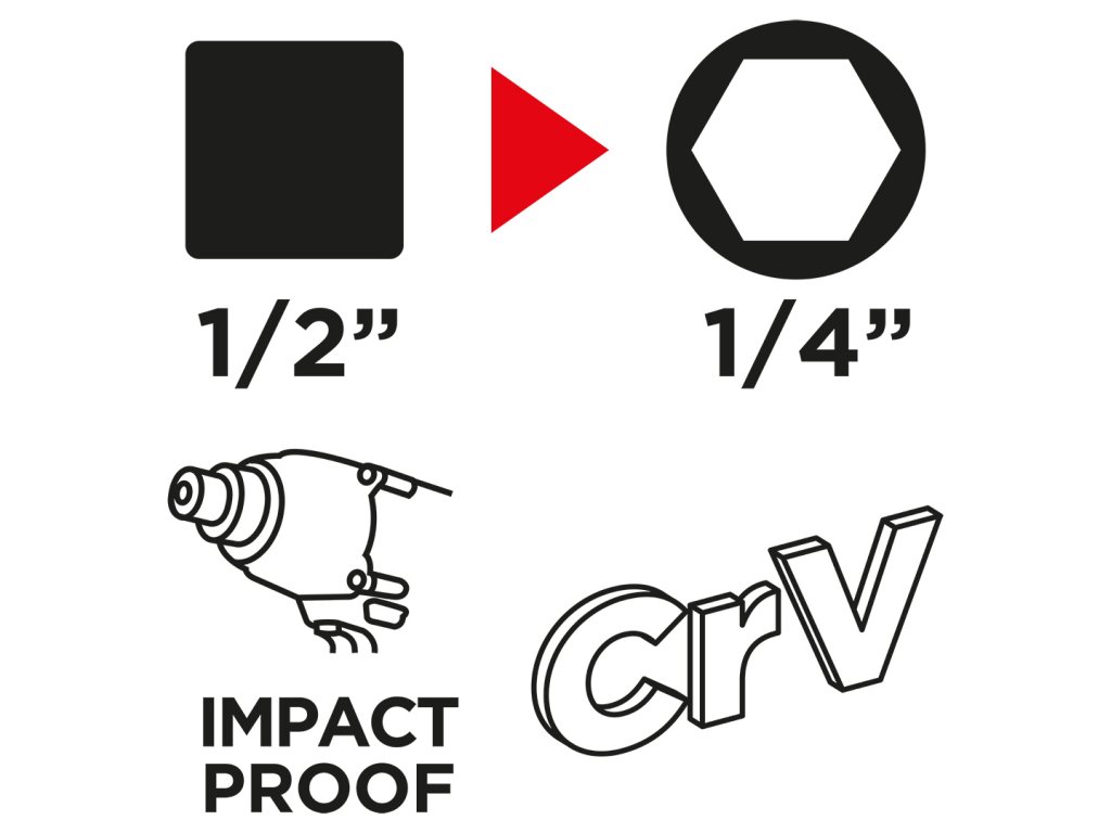 Adaptér ze čtyřhranu 1/2" na šestihran 1/4", robustní CrV ocel, délka 50 mm