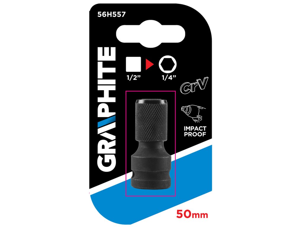 Adaptér ze čtyřhranu 1/2" na šestihran 1/4" 56H557 od společnosti GRAPHITE je vyroben z odolné CrV oceli. Má délku 50 mm a umožňuje změnit nástavec z 1/2" čtyřhranu na 1/4" šestihran. Adaptér je určen pro rázové klíče a šroubováky. Je vybaven praktickým otvorem pro snadnou montáž. Umožňuje rychlé upevnění bitů a vrtáků typu HEX. Díky vroubkovanému, protiskluzovému povrchu kroužku lze bity rychle a snadno vyměnit. Adaptér GRAPHITE se doporučuje pro profesionály a domácí kutily.