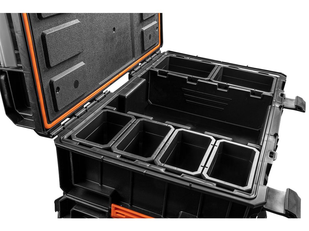 Modulový systém, sada NEO (ref. č. 84-259) je třímodulová stabilní konstrukce na plošině s koly sloužící k přepravě a skladování stavebních nástrojů Díky velmi pevné konstrukci umožňuje přepravu mnoha těžkých nástrojů a postavení se na krytu pro zvýšení dosahu. těsnění v krytech, odolnost vůči prachu a vodě, hluboké podnosy, vyhloubení pro řezání s měřidlem, velký objem.