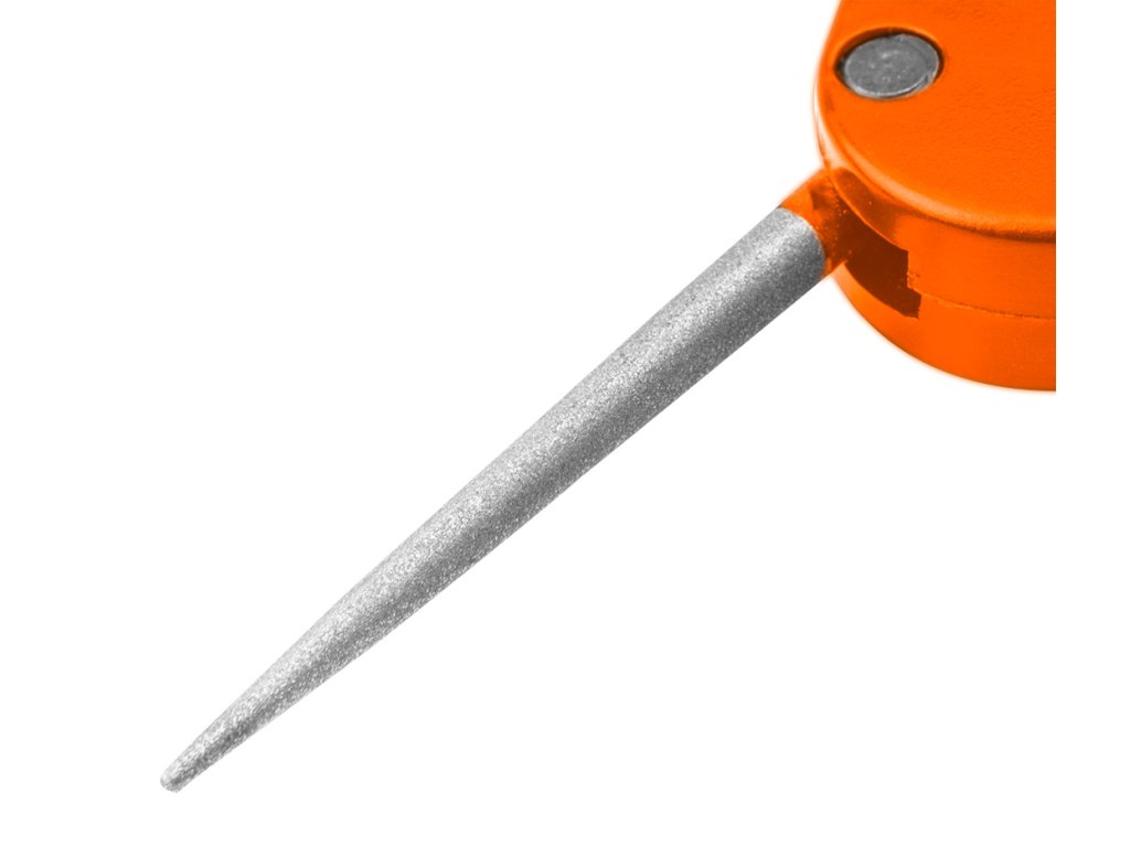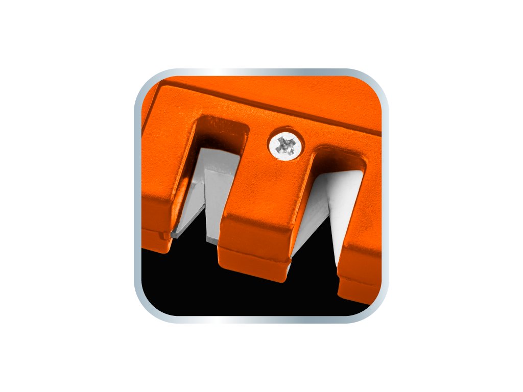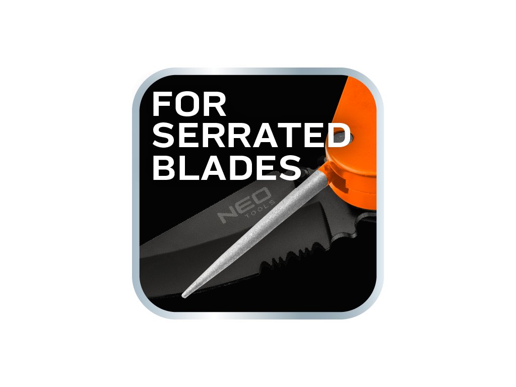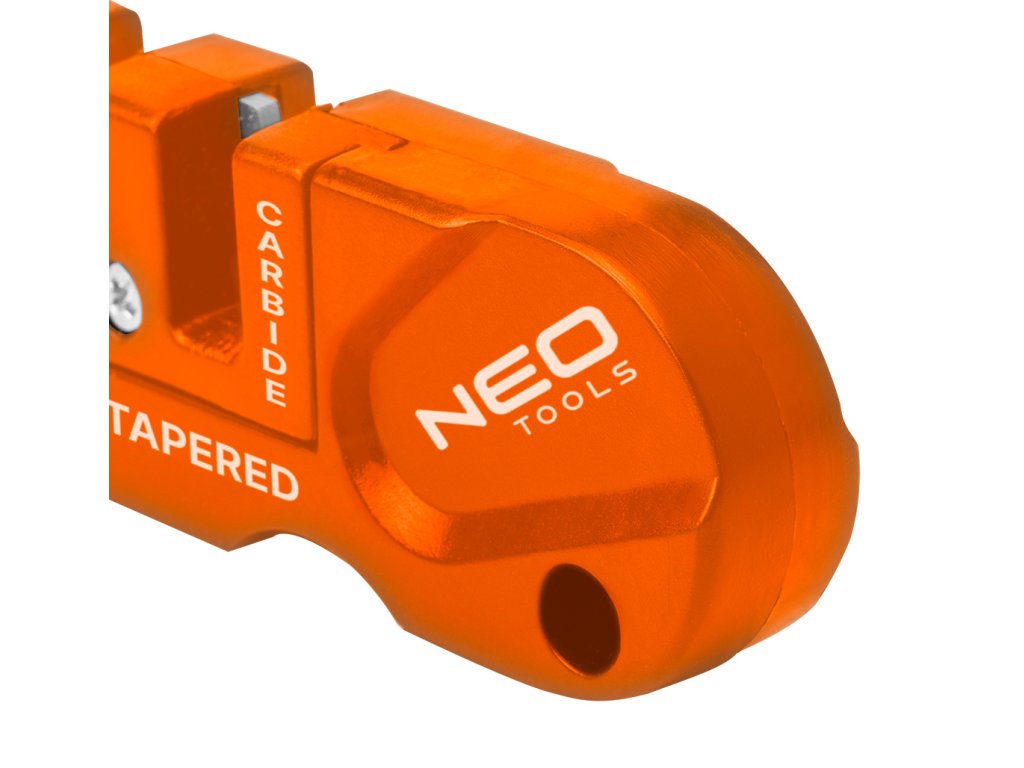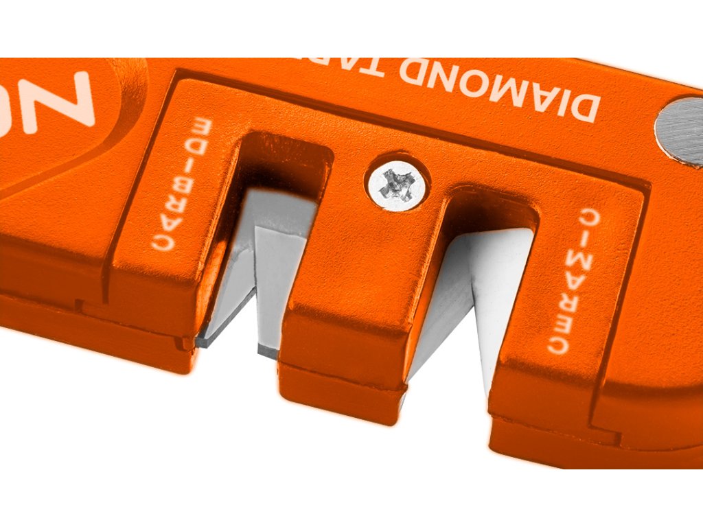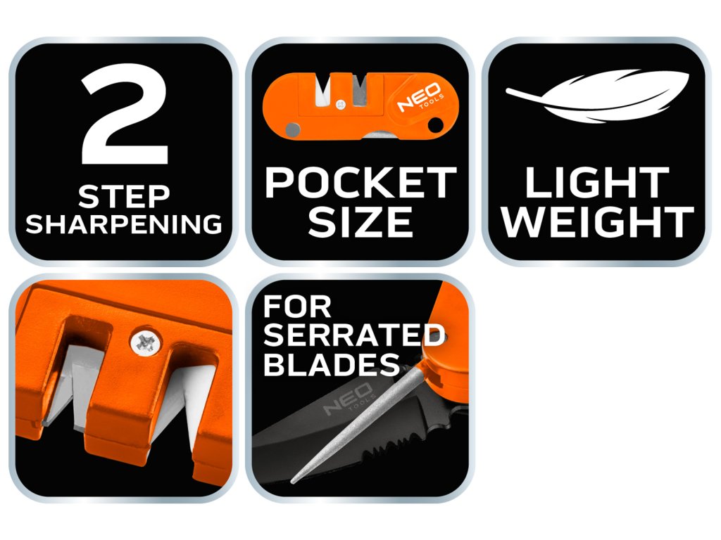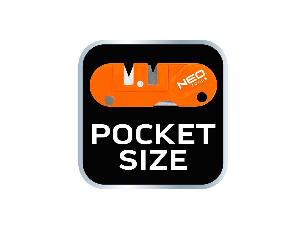 Bruska na nože, kapesní 56-054 od společnosti NEO je nástroj s pouzdrem vyrobeným z nárazuvzdorného plastu ABC, částečně pokrytého gumou TPR. Nabízí dvoustupňové ostření nožů - prvotní tvarování pomocí karbidu wolframu a konečné leštění pomocí keramiky. Umožňuje také ostření zubatých čepelí pomocí specializované tyče. Ostrouhač se vyznačuje ergonomicky tvarovanou rukojetí. Nabízí se s návodem k použití. Výrobky značky NEO se doporučují na širokou škálu aplikací včetně přežití nebo bushcraftu.
