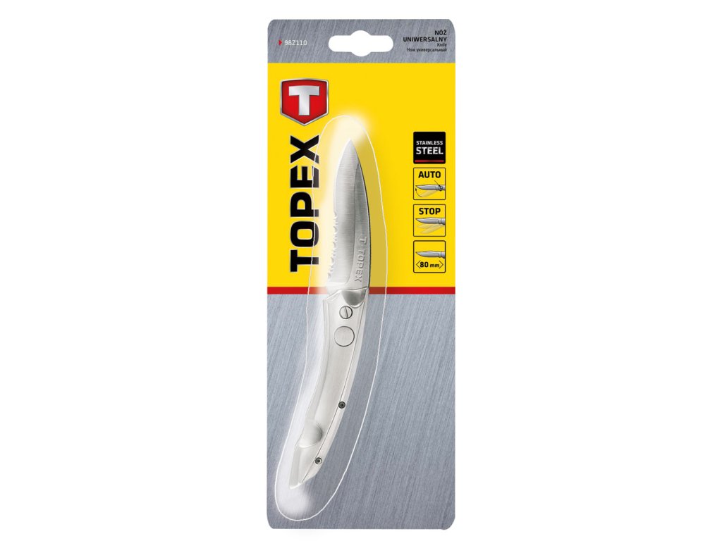 Univerzální nůž TOPEX (ref. 98Z110) s délkou čepele 80 mm. Čepel je vyrobena z vysoce kvalitní nerezavějící oceli, která zaručuje dlouhou životnost nástroje. Díky pevnému kovovému tělu lze provádět náročnou práci. Zámek čepele zajišťuje bezpečnost během používání. Pružinový mechanismus odvíjení čepele usnadňuje práci s nástrojem. Další výhodou je klip na opasek, díky kterému můžete mít nůž vždy po ruce. Dá se složit pro snadné skladování a přepravu. Značka TOPEX je určena pro domácí kutily.