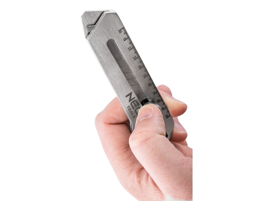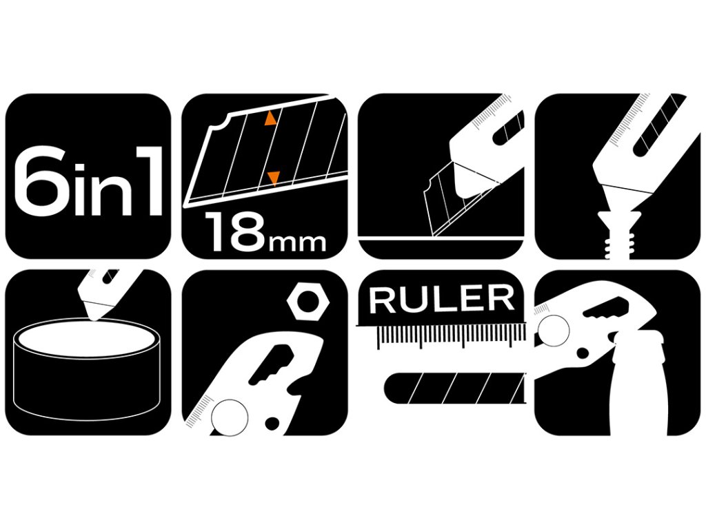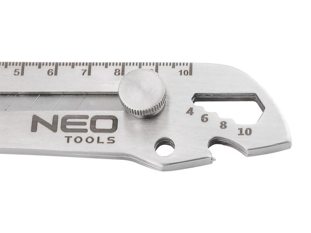 Multifunkční skládací nůž NEO TOOLS 63-713 6 v 1 je multifunkční nástroj 6 v 1, který kromě 18 mm dlouhého skládacího nože obsahuje také praktický šestihranný klíč na šrouby: 4 - 6 - 8 - 10 mm, otvírák na láhve, otvírák na konzervy, pravítko a plochý šroubovák. Tělo je vyrobeno z nerezavějící oceli a má celkovou délku 155 mm. Nářadí NEO TOOLS se osvědčí při řezání, podřezávání, otevírání plechovek, lahví nebo odšroubování malých šroubů. Je to chytrý výrobek s možností mnoha aplikací.
