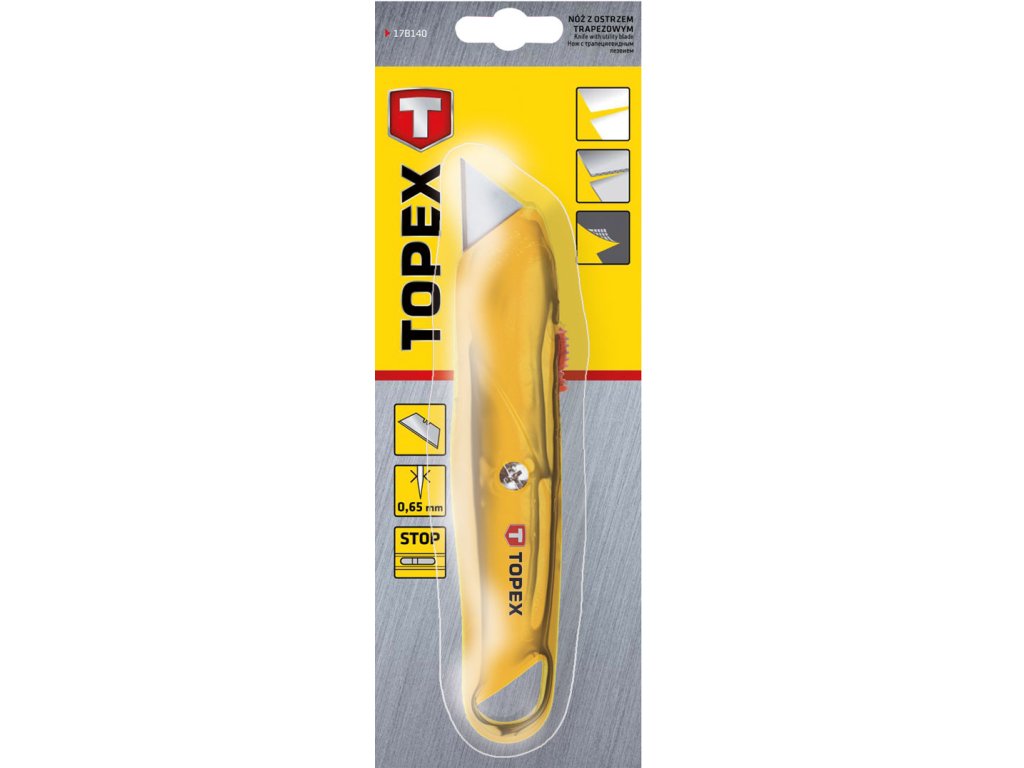 Nůž s lichoběžníkovou čepelí TOPEX (ref. 17B140) velmi užitečný při mechanických pracích a pro kutily. Kovové tělo zaručuje dlouhou životnost nástroje. Praktickým řešením je sklad nožů – náhradní nože jsou vždy po ruce. Ergonomický tvar poskytuje pohodlí při používání. Značka TOPEX je určena pro domácí kutily.