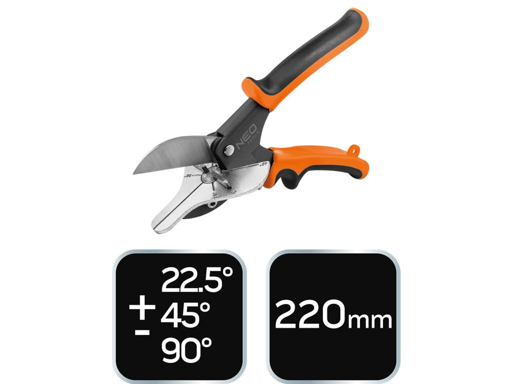 Úhlová fréza 220 mm 01-260 od společnosti NEO je 220 mm dlouhý nástroj pro řezání úhlů. Dvousložková rukojeť, čepel z oceli SK5 a hliníkové tělo přispívají k odolnosti nůžek. Pohyblivé nastavení úhlu řezu nabízí rozsah: 30, 45 a 90 stupňů. Nástroj umožňuje pohodlné řezání plastových pásů. Při práci montéra bude nepostradatelný. Nůžky značky NEO doporučené pro dlouholeté používání.