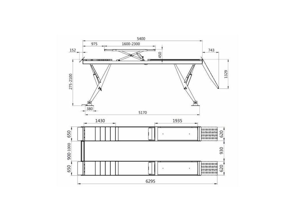 Load Capacity 5,500 kg Sub-Lift Load Capacity 4,000 kg Lifting Height (sub-lift) 2,100 (450) mm Minimum Height 275 mm Platform Length 5,400 mm Sub-Lift Platform Length 1,600 - 2,30 Scissors 900 - 1,000 mm Lifting Time <90 s Electric Supply 400V/50 Hz Power 3.0 kW