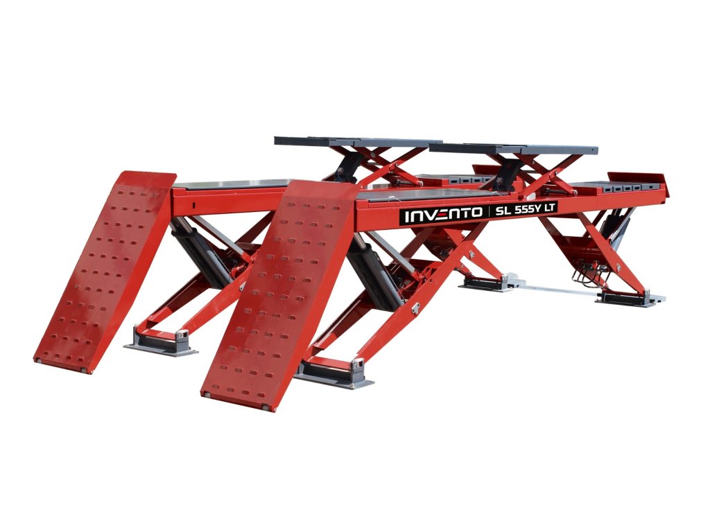 INVENTO SL 555Y LT je zvedák s nosností 5,5 tuny, s 8 válci, se 2 na každém konci každé plošiny Konstrukce zvedače ve tvaru Y jej činí stabilnějším při práci s těžkými užitkovými vozidly.
