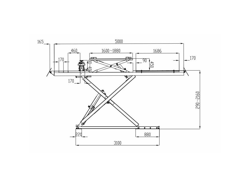 Lifting capacity 5,000 kg Lifting capacity of sill lifting jack 4,000 kg Lifting height (on the sill) 2 160(430) mm Minimum height 290 mm Platform length 5,000 mm Length of sill lifting jack0 608 mm Scissors spacing 997 mm Lifting time 70 s Electric power supply 400V/50Hz Power 3.5 kW