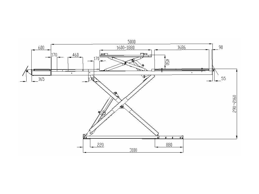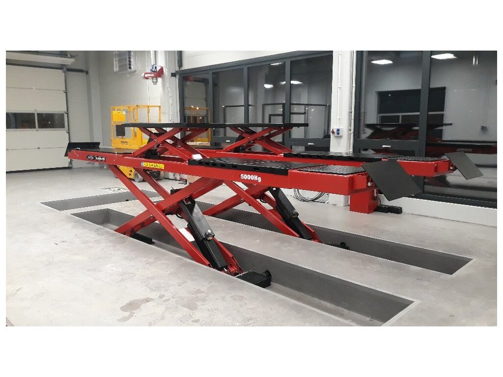 Lifting capacity 5 000 kg Lifting capacity of sill lifting jack 4 000 kg Lifting height (on the sill) 2 160(430) mm Minimum height 290 mm Platform length 5 000 + 607 mm Length of sill l00 0 mm Platform width 607 mm Scissors spacing 984 mm Lifting time 70 s Electric power supply 400V/50 Hz Power 3,5 kW