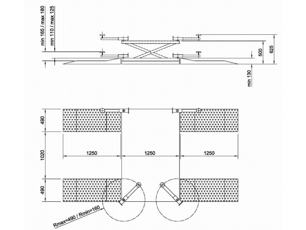 Lifting capacity: 3,500 kgMaximum lifting height: 625 mmMinimum height: 130 mmLift délka bez ramps: 1,250 mmLift width: 2,000 mm