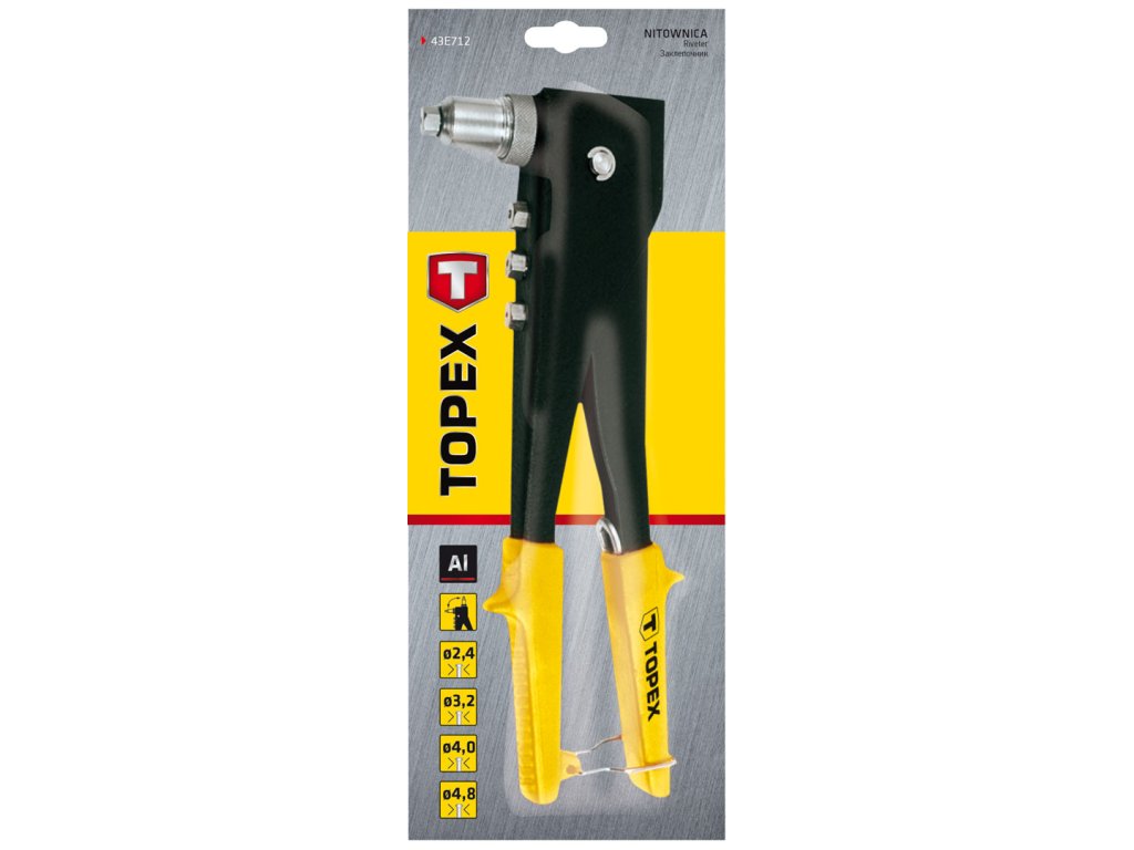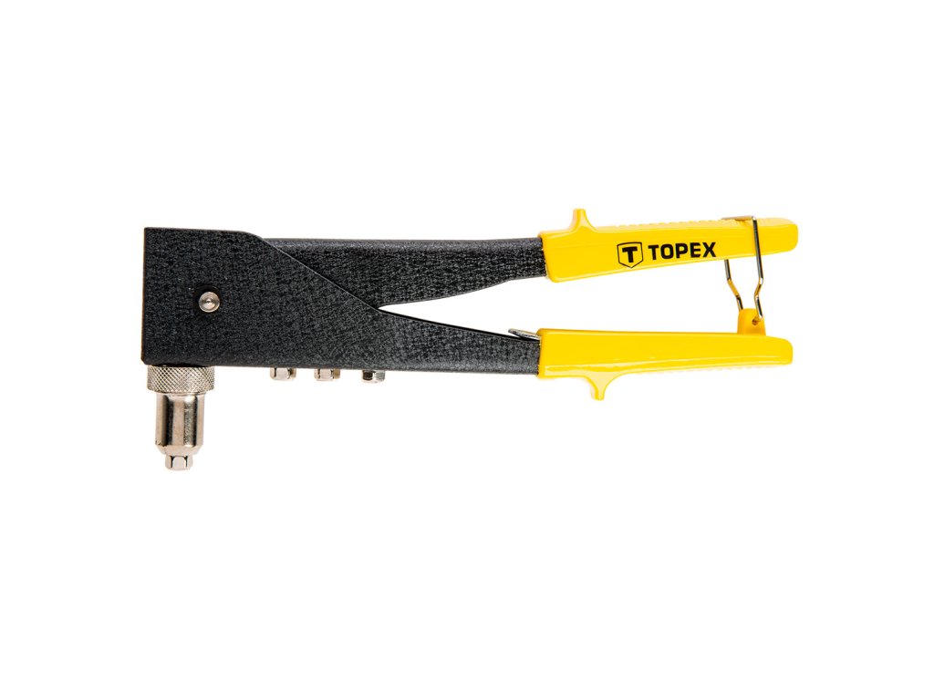TOPEX nýtovací nástroj (ref. 43E712) na hliníkové nýty o průměru 2,4, 3,2, 4,0, 4,8 mm. 2-polohová hlava umožňující nýtování na těžko přístupných místech. Robustní ocelová horní rukojeť a tělo s nýtovací matricí. Prodloužená přední část pro snadné nýtování v obtížně přístupných místech. Pohodlné rukojeti s uzamykacím kroužkem pro snadné skladování. Značka TOPEX je určena pro domácí kutily.