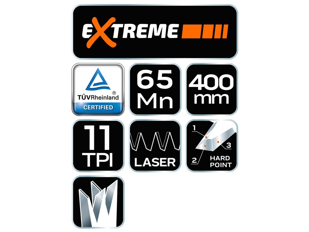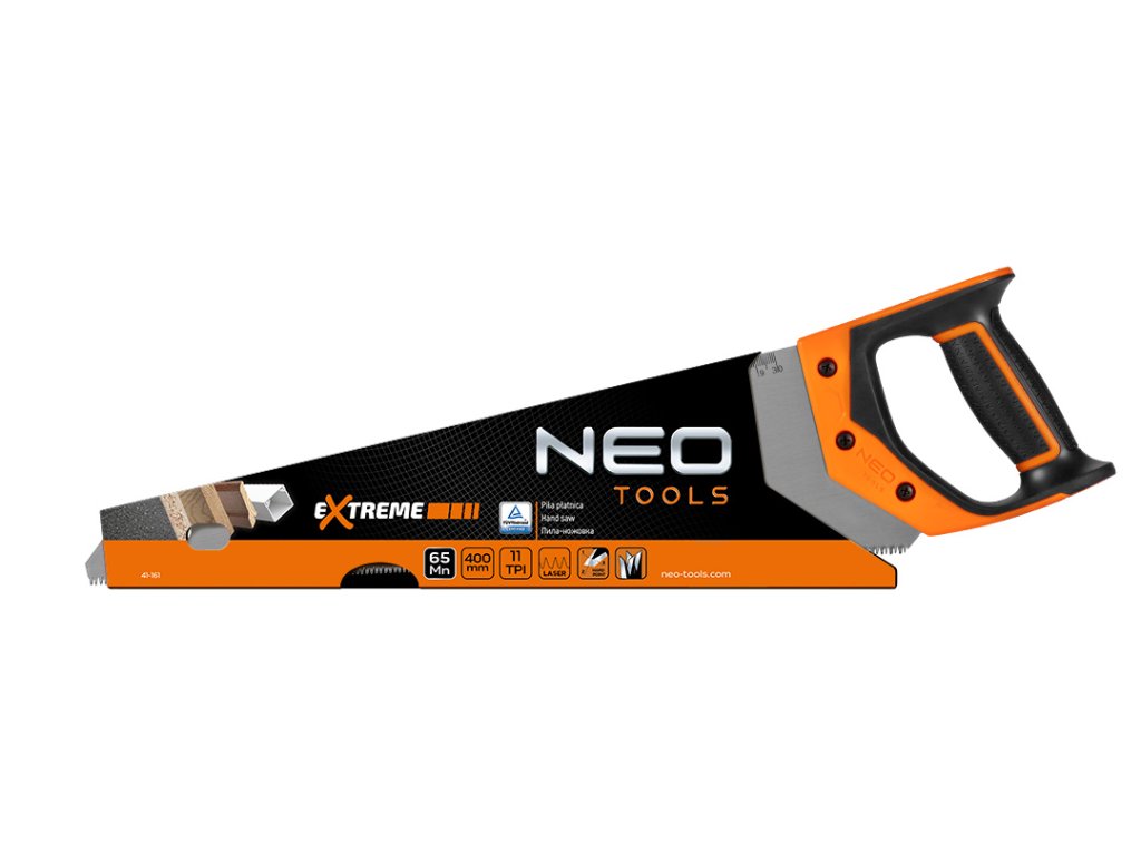 NEO rozřezávací pila (ref. 41-161) s délkou čepele 400 mm. Lehká, ale robustní konstrukce pro efektivní a rychlé řezání. Trojstranně naostřené a indukčně kalené zuby výrazně snižují řezný odpor a usnadňují řezání dřeva podél vláken. Ozubení 11 zubů na palec umožňuje rychlý a hrubý řez. Vysoká odolnost oceli zaručuje dlouhou životnost. Ergonomická rukojeť s protiskluzovým materiálem pro bezpečné a stabilní vedení během řezání. Na hraně pily je praktická stupnice.