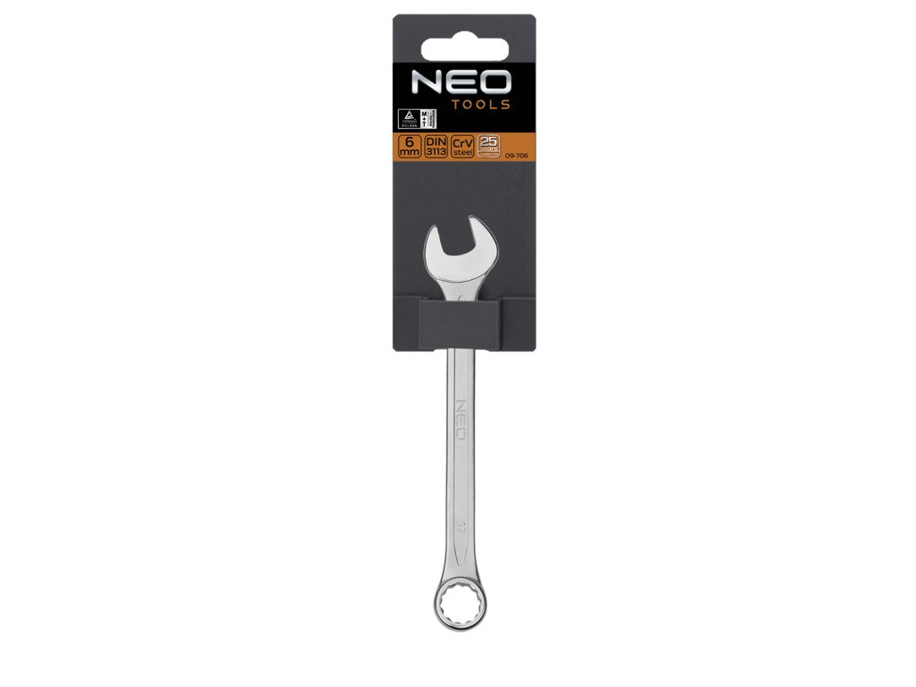 kombinovaný klíč NEO (ref. 09-706) velikosti 6 x 100 mm, vyrobený podle normy DIN 3113. Vysoce kvalitní chrom-vanadiová ocel zaručuje dlouhodobou odolnost klíče. Kvalita nářadí potvrzená certifikátem TÜV a 25letou zárukou výrobce. Značka NEO splňuje očekávání profesionálů.