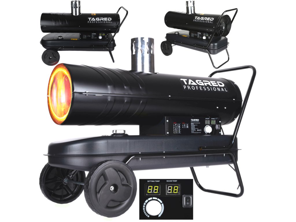 Velmi výkonný ohřívač, výfukový ventilátor, olejový s komínem TAGRED, výkonem 30 kW, termostatem a LCD displejem.
