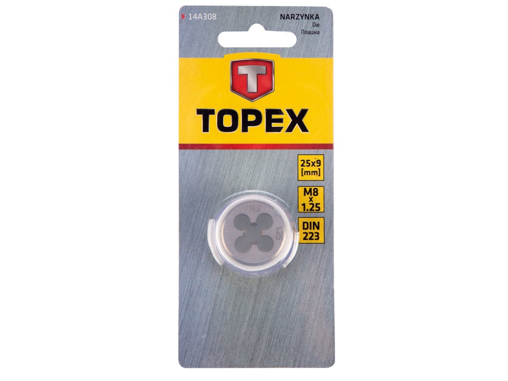TOPEX závitořez (ref. 14A308) ve velikosti M8 je multifunkční nástroj, který se používá pro řezání vnějších závitů. Vyrobeno z vysoce kvalitní wolframové oceli. Zárukou spolehlivosti výrobku je soulad s normou DIN 233. Značka TOPEX je určena pro kutily.
