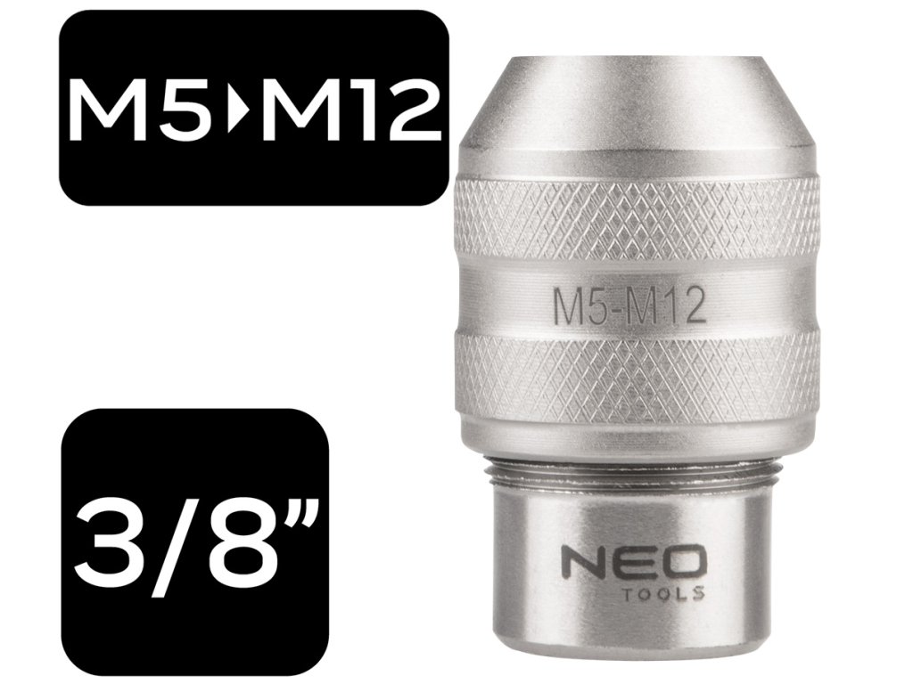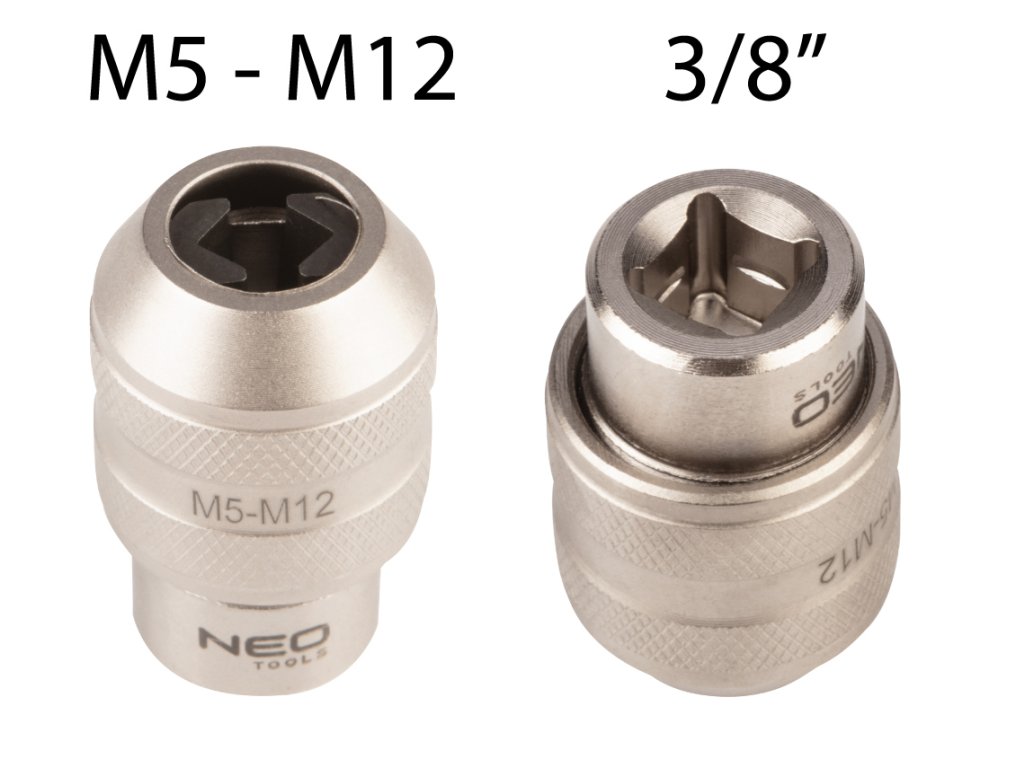Adaptér na závitníky, 3/8" DR M5-M12, 12-906 od společnosti NEO TOOLS je univerzální nástroj, který je vhodný pro mnohé příslušenství a zařízení s pohonem 3/8" (např. 3/8" ráčna nebo 3/8" rukojeť šroubováku). Snadno se používá a je robustní. Vyrobeno z odolné CRV oceli. Díky nastavitelné velikosti pro závitníky bude dobře fungovat v profesionálních i amatérských aplikacích. Díky tomuto adaptéru pro závitníky NEO TOOLS lze používat mnoho nástrojů v rozsahu velikostí od M5 do M12.