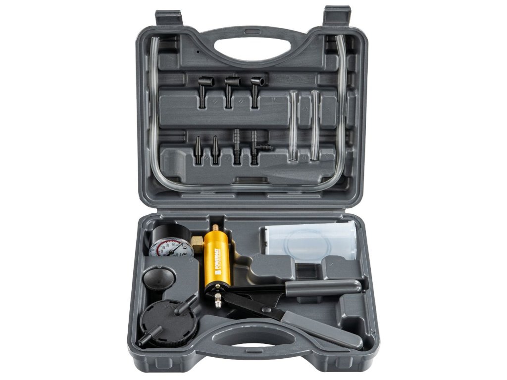 Celá sada je uložena v praktickém přepravním kufříku , který zajišťuje přehledné uskladnění a snadný přenos. Odolné zpracování a kompaktní rozměry dělají z této pumpy ideálního pomocníka do každé dílny, autoservisu i pro kutily.