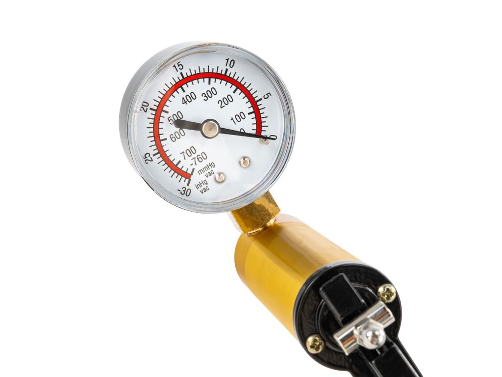 Ruční vakuová pumpa s manometrem pro diagnostiku podtlakových systémů, podtlak až -1 bar, přesné měření, ideální pro servis a dílnu.